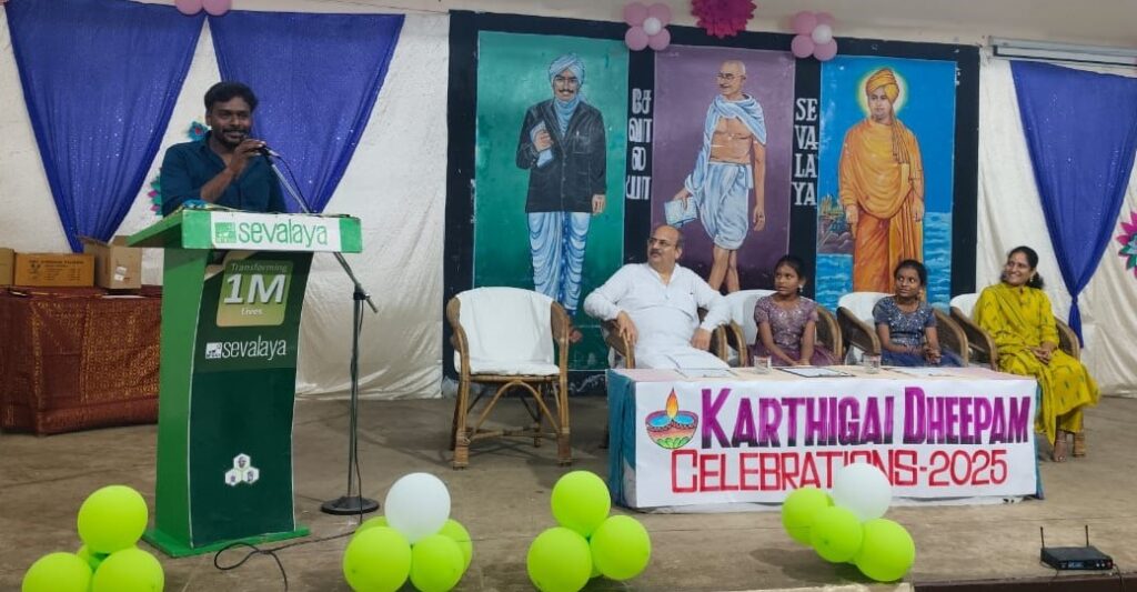 Sevalaya alumnus G Sathish, participated along with his family and graced the occasion as the Chief Guest. He lit the traditional lamp and inaugurated the event. Speaking on the occasion, he advised the students to work hard, stay united, pursue a promising career and achieve success. He encouraged them to return to Sevalaya later in life, just as he had come back now. As part of the birthday celebrations for his daughter, he distributed chocolates, cakes and pens to Sevalaya children. Students presented engaging cultural performances.