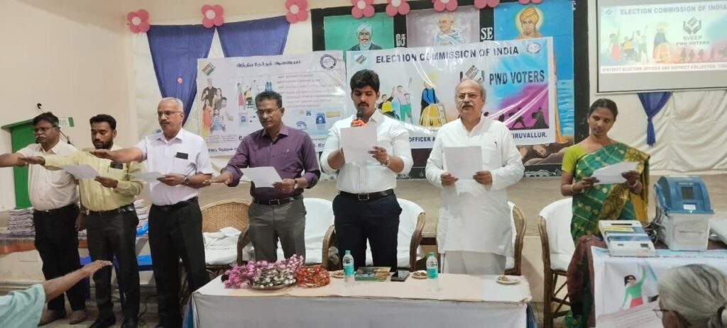 He also said that arrangements would be made for the elderly who have completed 85 years of age to vote from their place of residence itself. Following this, he administered an election pledge to everyone present. The Collector also presented the elders with flower crowns and shawls, inquired about their well-being and encouraged them to vote. He also taught an elderly resident how to vote using the voting machine.